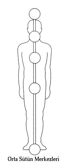 Tüm sistem yandaki resimde gösterilmiştir. Merkezleri birleştiren çizgi, eksen ve bedenin esas enerji kanalı, Orta Sütunun kendisidir. Eğer önceki bölümden herhangi ritüel çalışması yaptıysanız, bu motife aşina olabilirsiniz. Başın üstündeki ışık küresi ve ayak altındaki dünya ile Kabalistik Haçın dikey çizgisi aynı enerjiler kanalını simgelemenin diğer bir yoludur ve bu enerjileri bedenin deşik seviyelerinde dengelemenin farklı ama ilişkin bir yolunu sağlamaktadır.